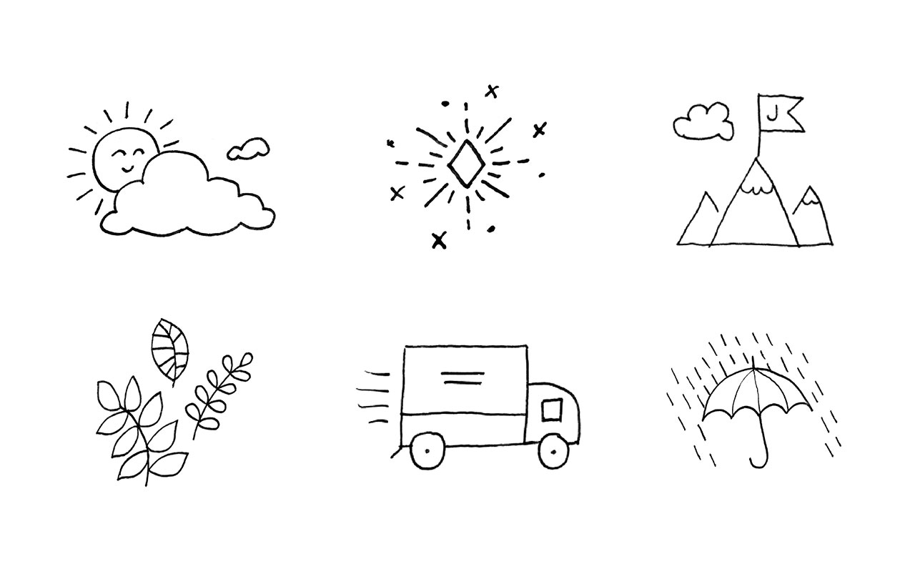 I created a suite of hand drawn illustrations to add fun and whimsical touches where needed. The color palette for the website is limited to black and white because the product photos and illustrations bring so much personality to the brand on their own.