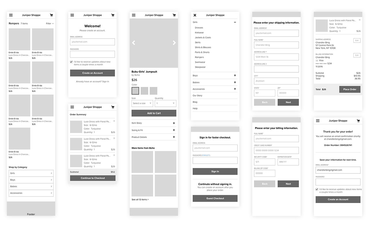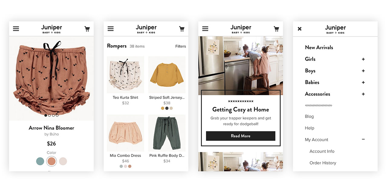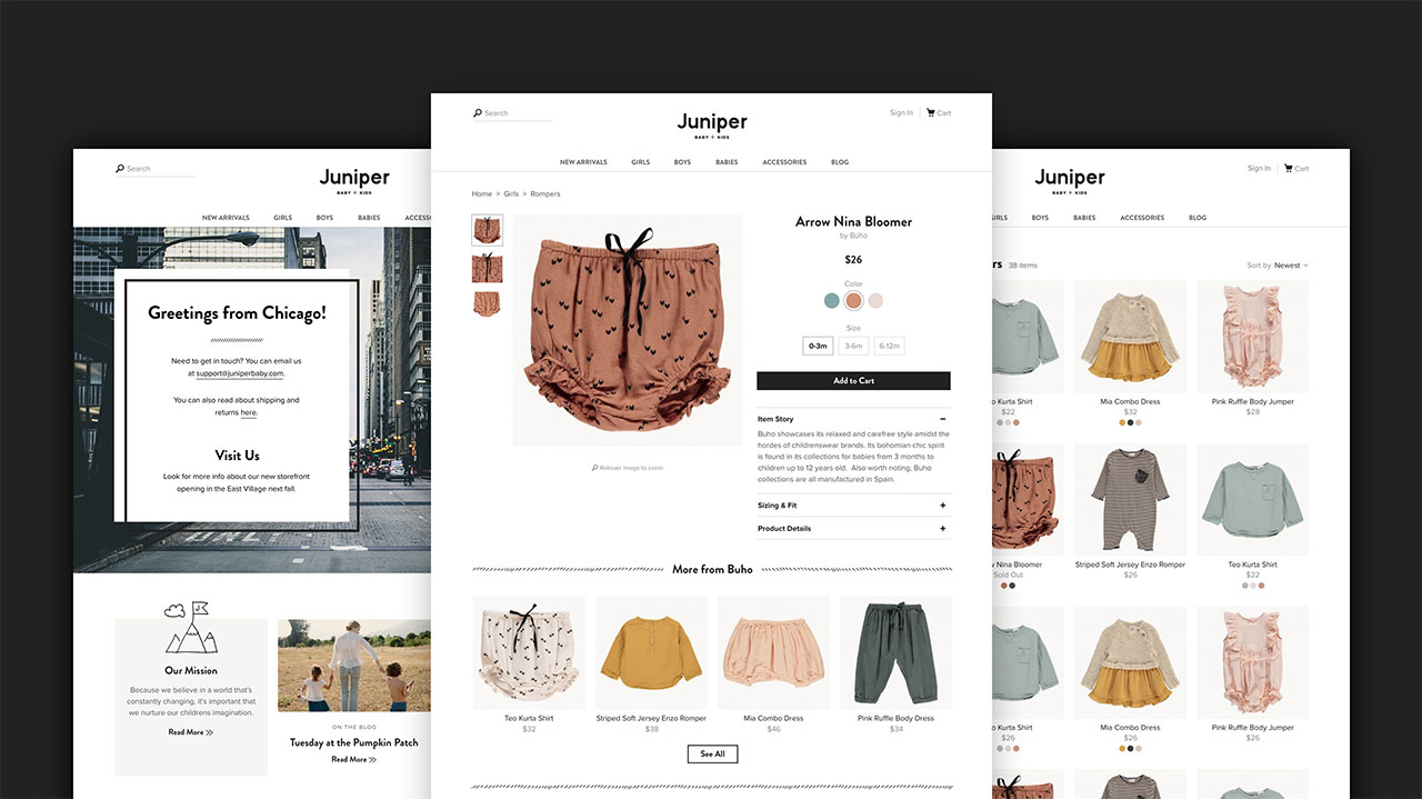 Since Juniper is a small boutique, there isn’t as much inventory as large department stores. The homepage helps lead customers to small collections with branded stories, while the product page is straightforward and simple for a frictionless browsing experience.