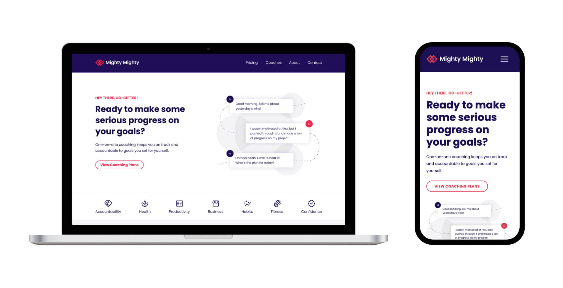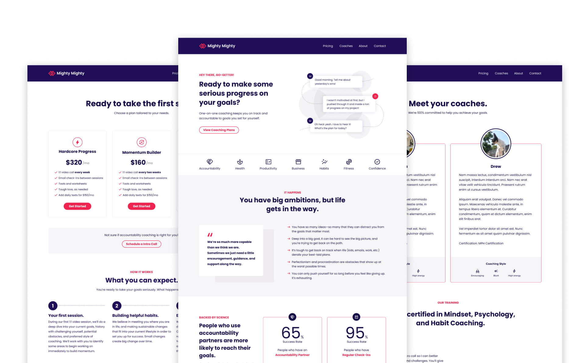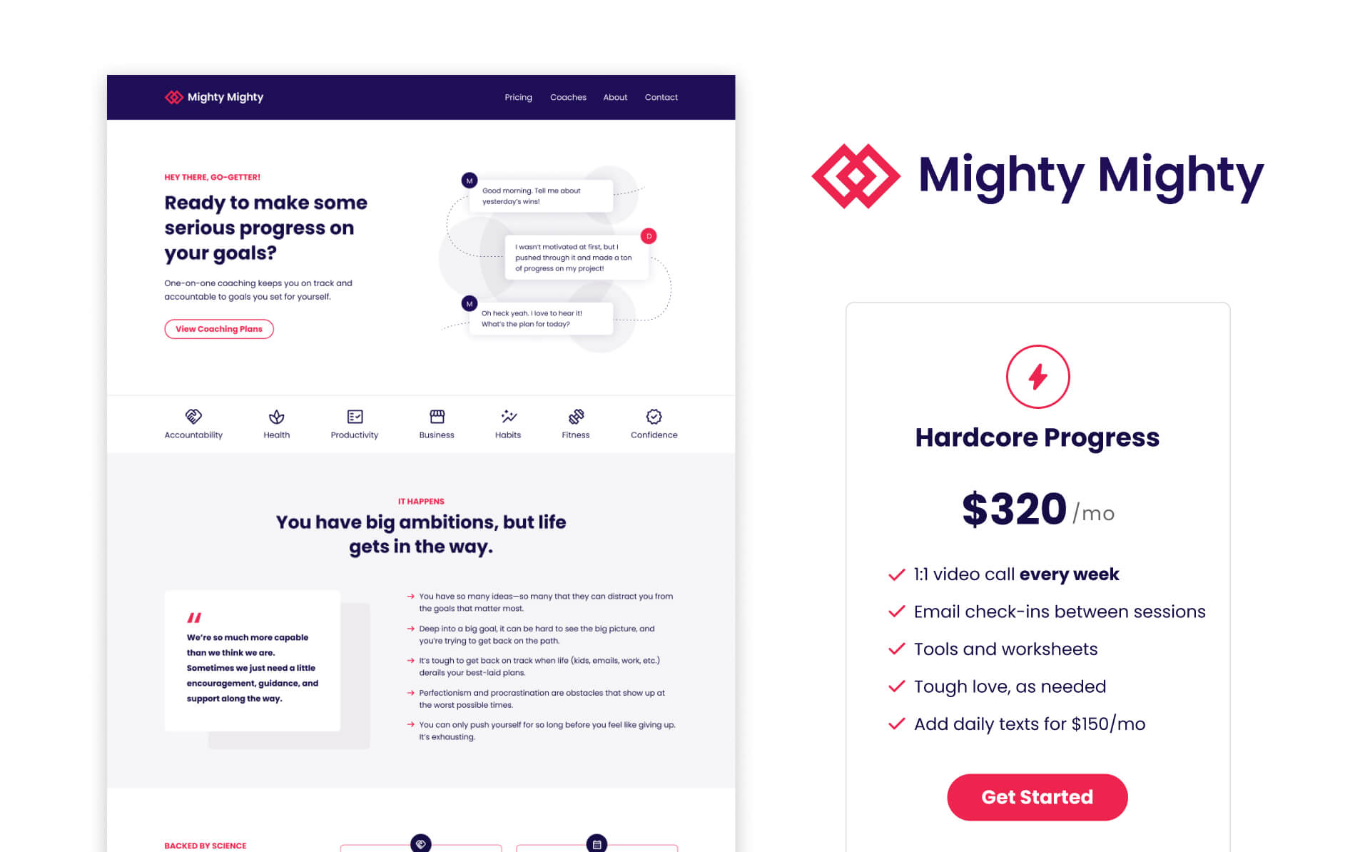Mighty Mighty is a 1:1 accountability coaching business that specializes in mindset and habit changes to help people reach their goals. They needed a complete branding package and website that focused on relating to their audience, explaining the benefits of accountability coaching, and converted their audience into customers.