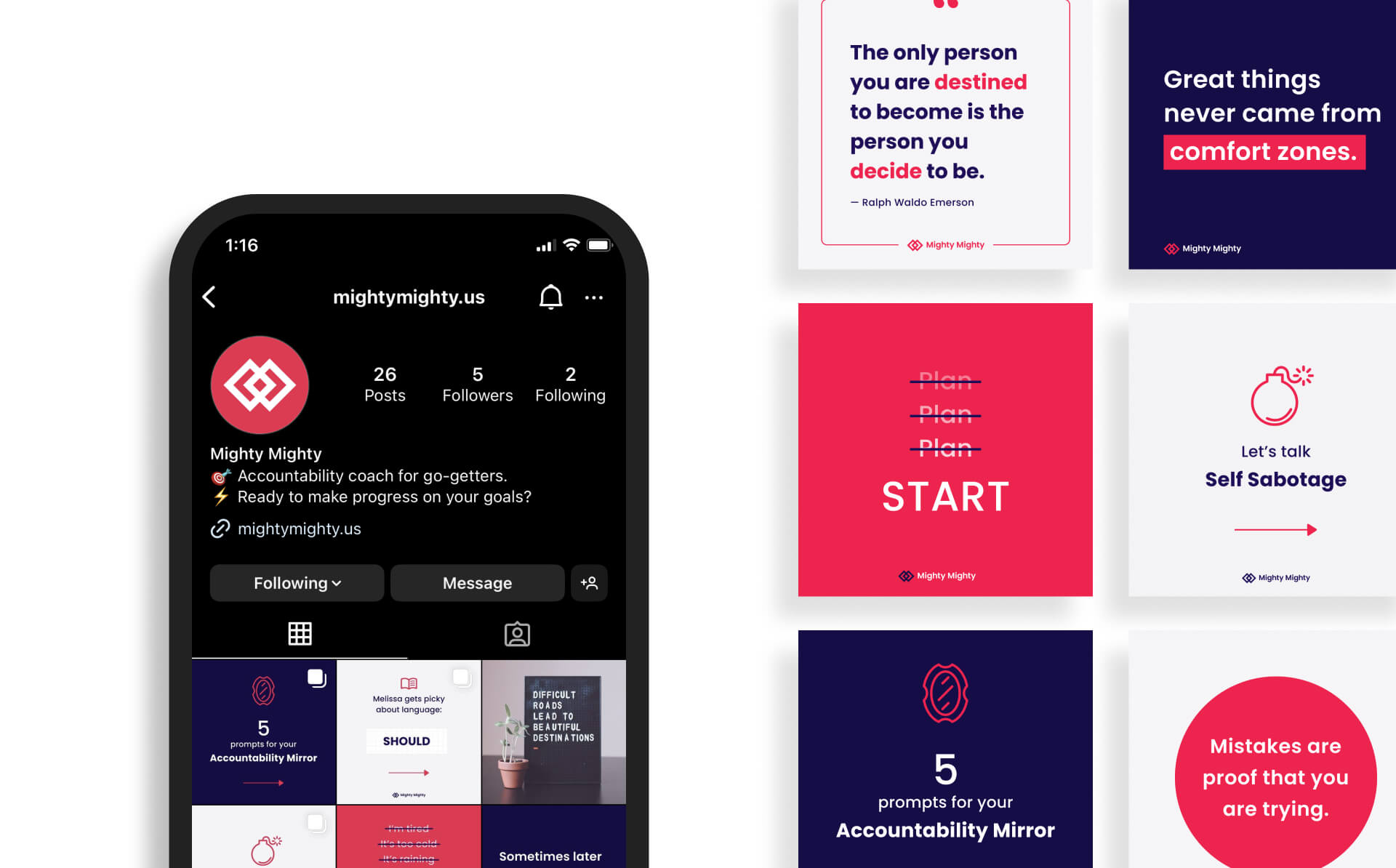 Mighty Mighty was going to make a big marketing effort on social media, where their audience regularly follows coaches or motivational accounts for inspiration. I designed a cohesive and flexible suite of post styles so that they could share a wide range of content, from quotes and informative charts, to carousels of useful tips and information for their audience. To top everything off, I created business cards since some of their customers come from networking and words of mouth.
