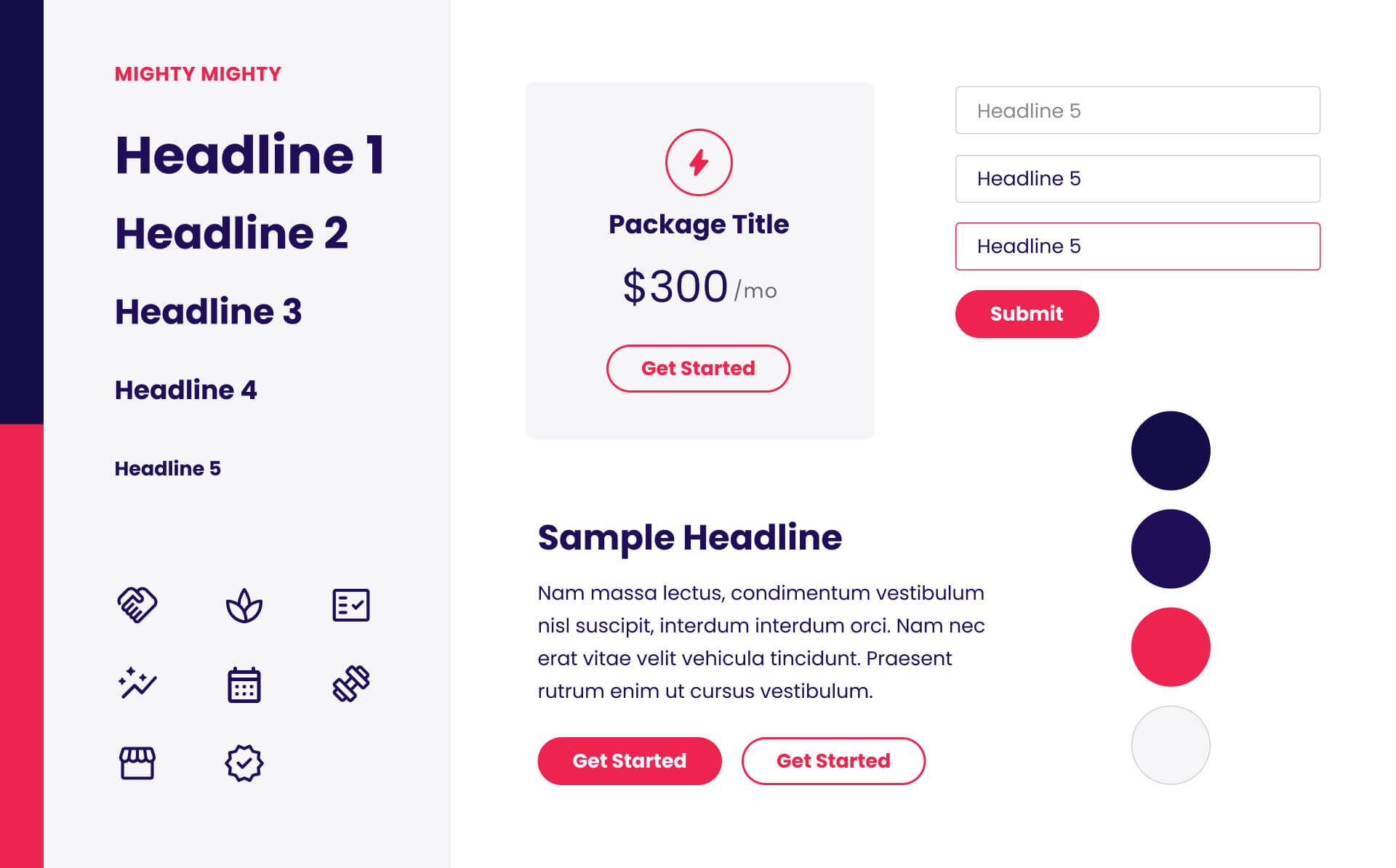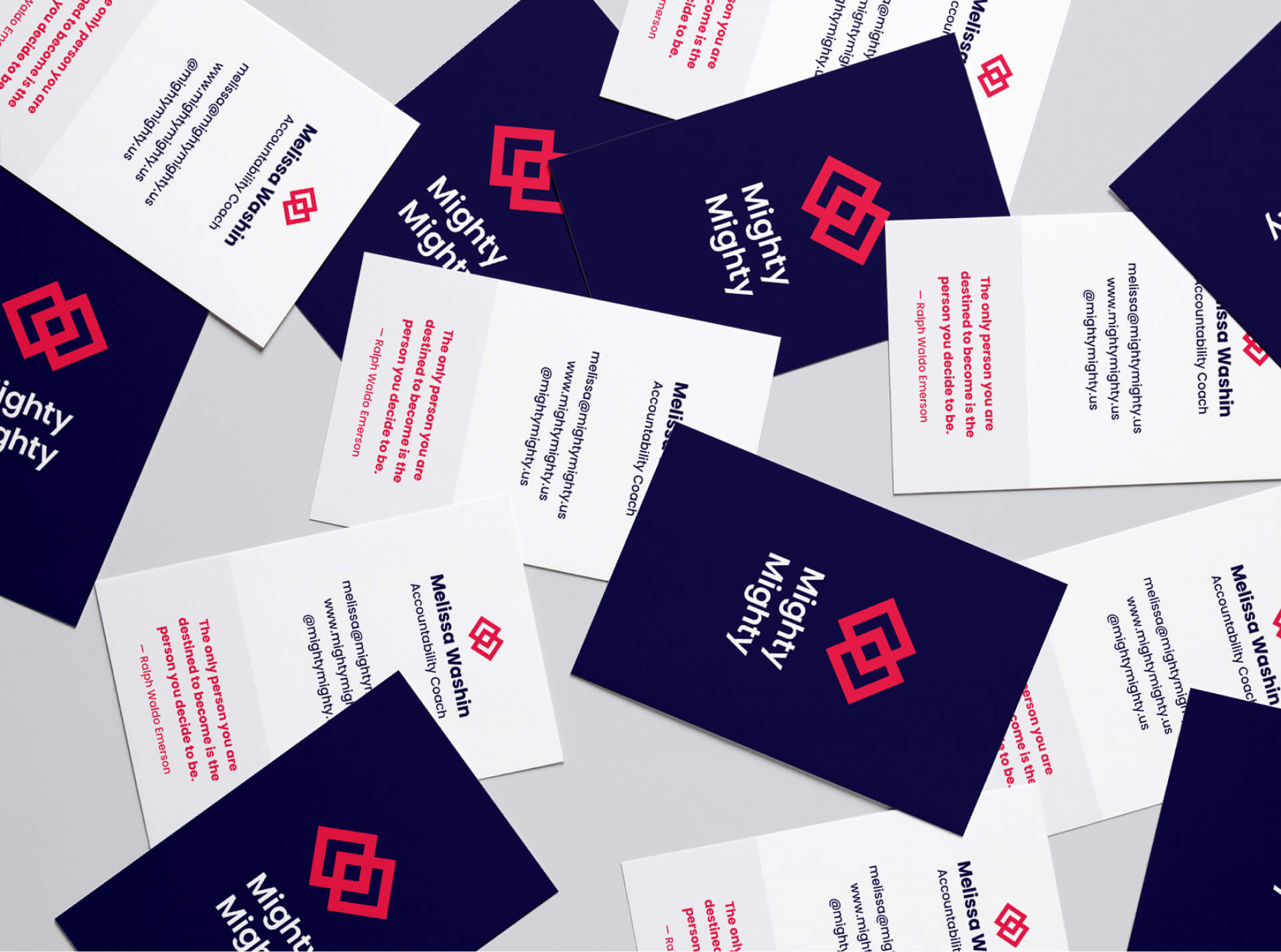 When tackling their identity design, it was important to help Mighty Mighty stand out from other 1:1 coaching services that talked about self-love, and had a feminine, life-coach-y feel. Accountability coaching is backed by scientific research, and focuses on action and momentum. The color scheme and logo feel energizing, modern, and activating, representing the mindset shift in coaching clients and amping them up to take the next step.