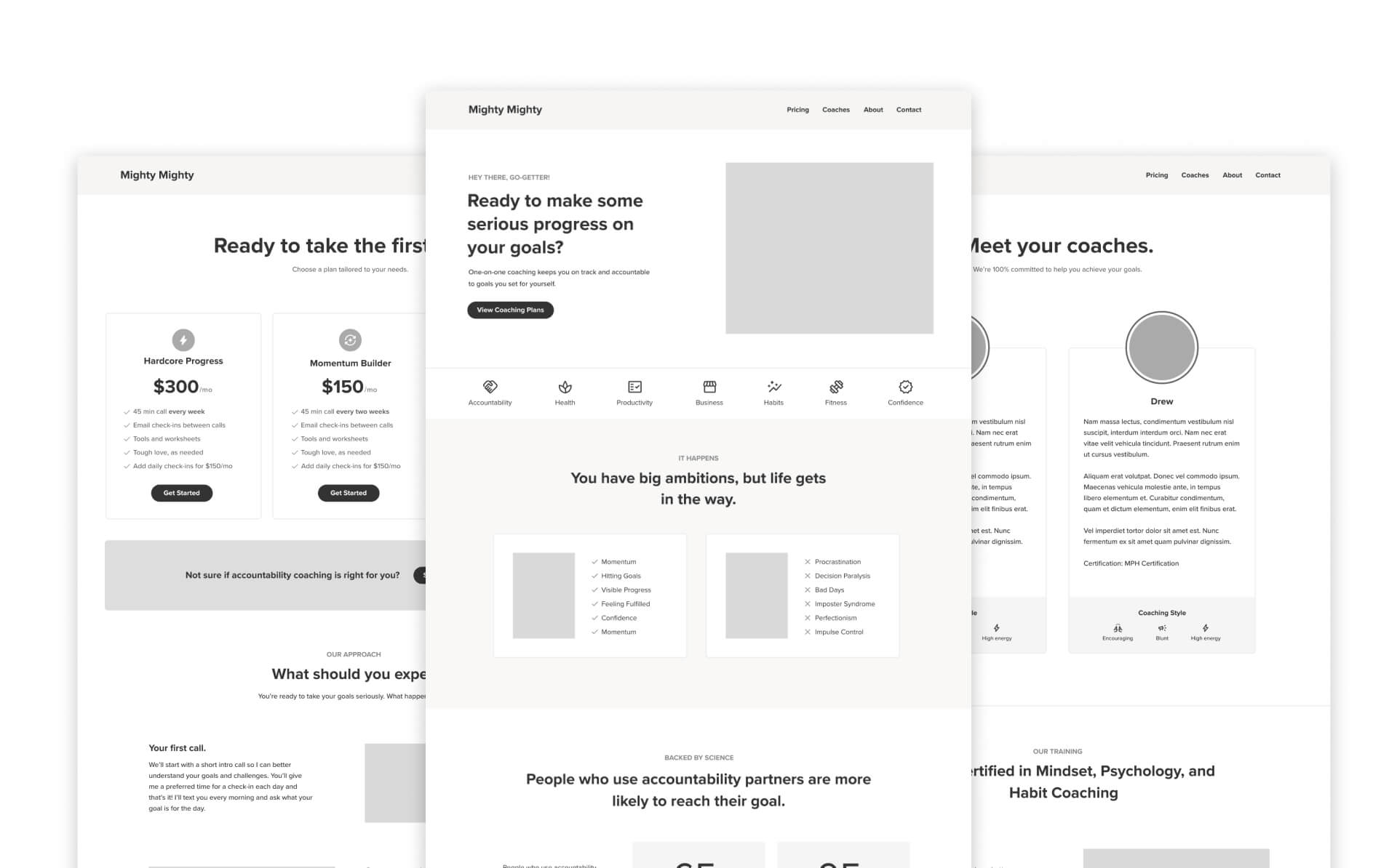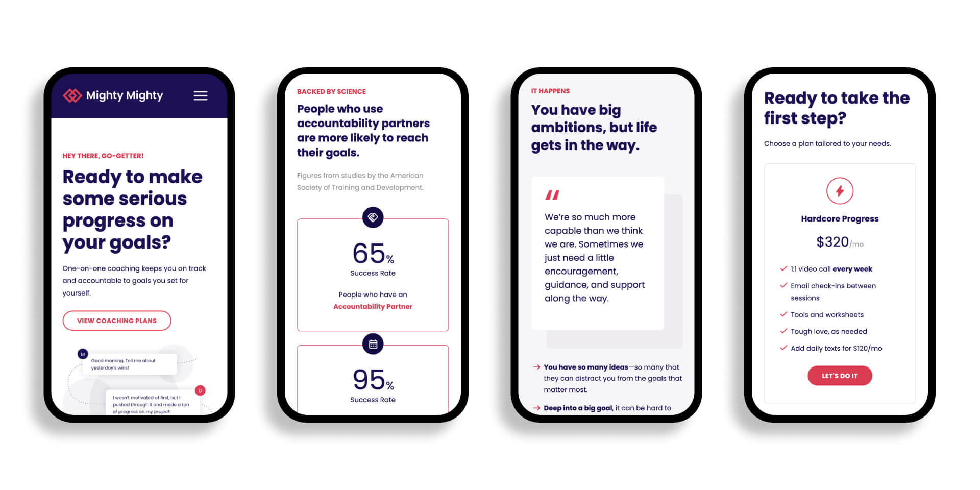 One of the most important aspects of the website was the content strategy. In order to convert visitors into customers, we had to deeply understand what problems and hurdles the audience was facing in achieving their goals, show them we understand those hurdles, and why Mighty Mighty’s approach is scientifically proven to help people exactly like them make progress toward anything they’re working on.